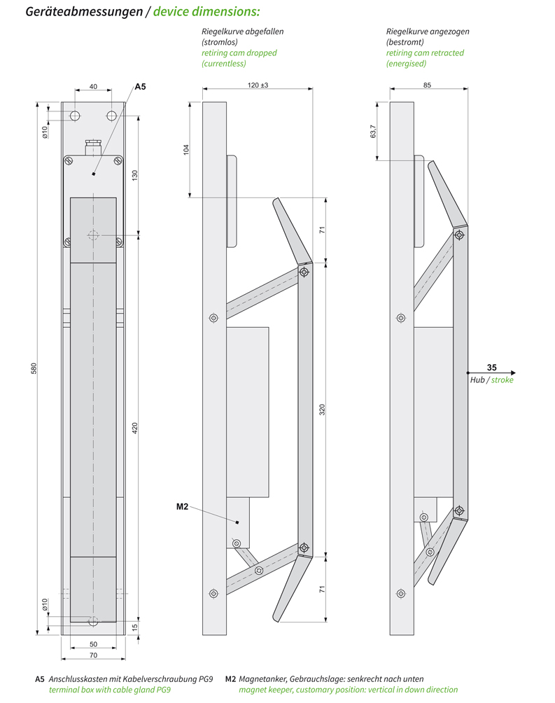 The electromagnetic retiring cam EMT17-W has the level of protection IP44 and is mounted at the side of the lift car. It is pneumatically absorbed and thefore operates silently. The version EMT18-W is equipped with a higher force, but apart from that it is identical with the more common version EMT17-W.