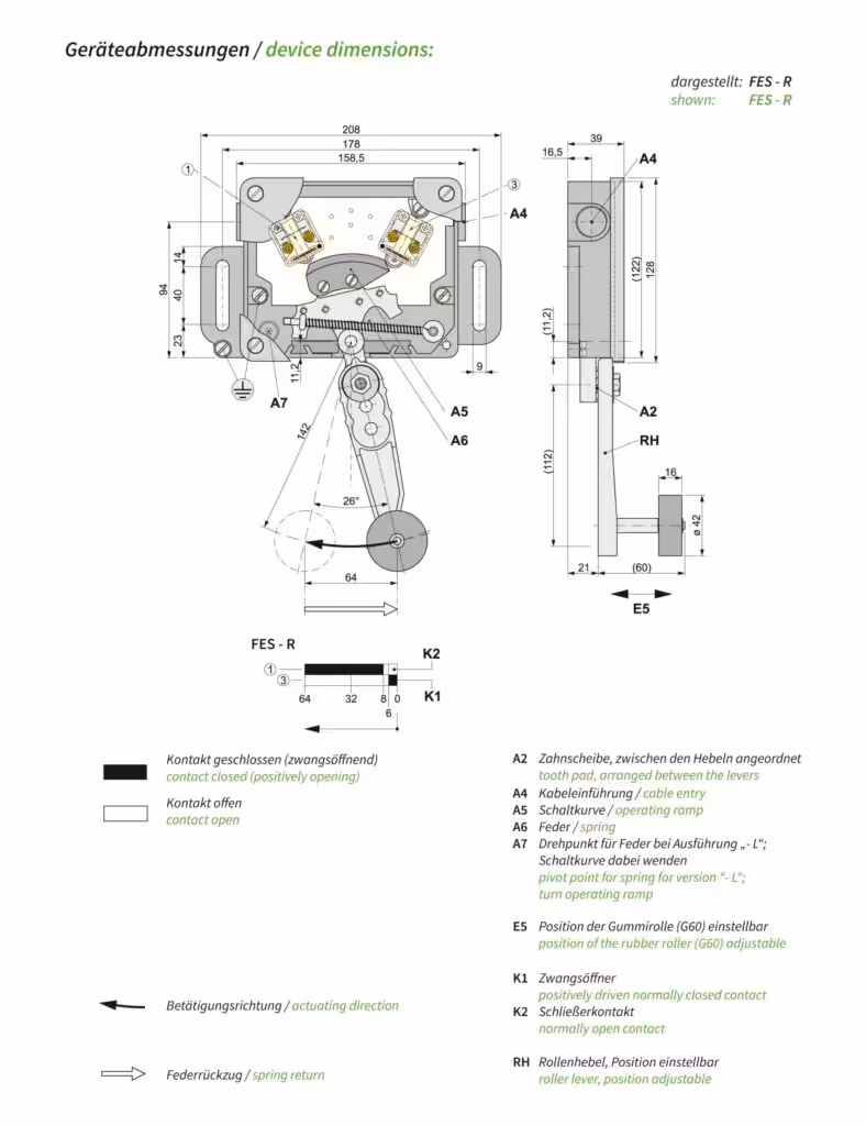 The terminal limit switch FES is a safety switch with forced actuation. It is preferably used as limit switch in the highest or lowest landing of lifts. The return to the initial position is done by a guided compression spring. The limit switch is actuated at the roller lever by fixed operating ramps.
