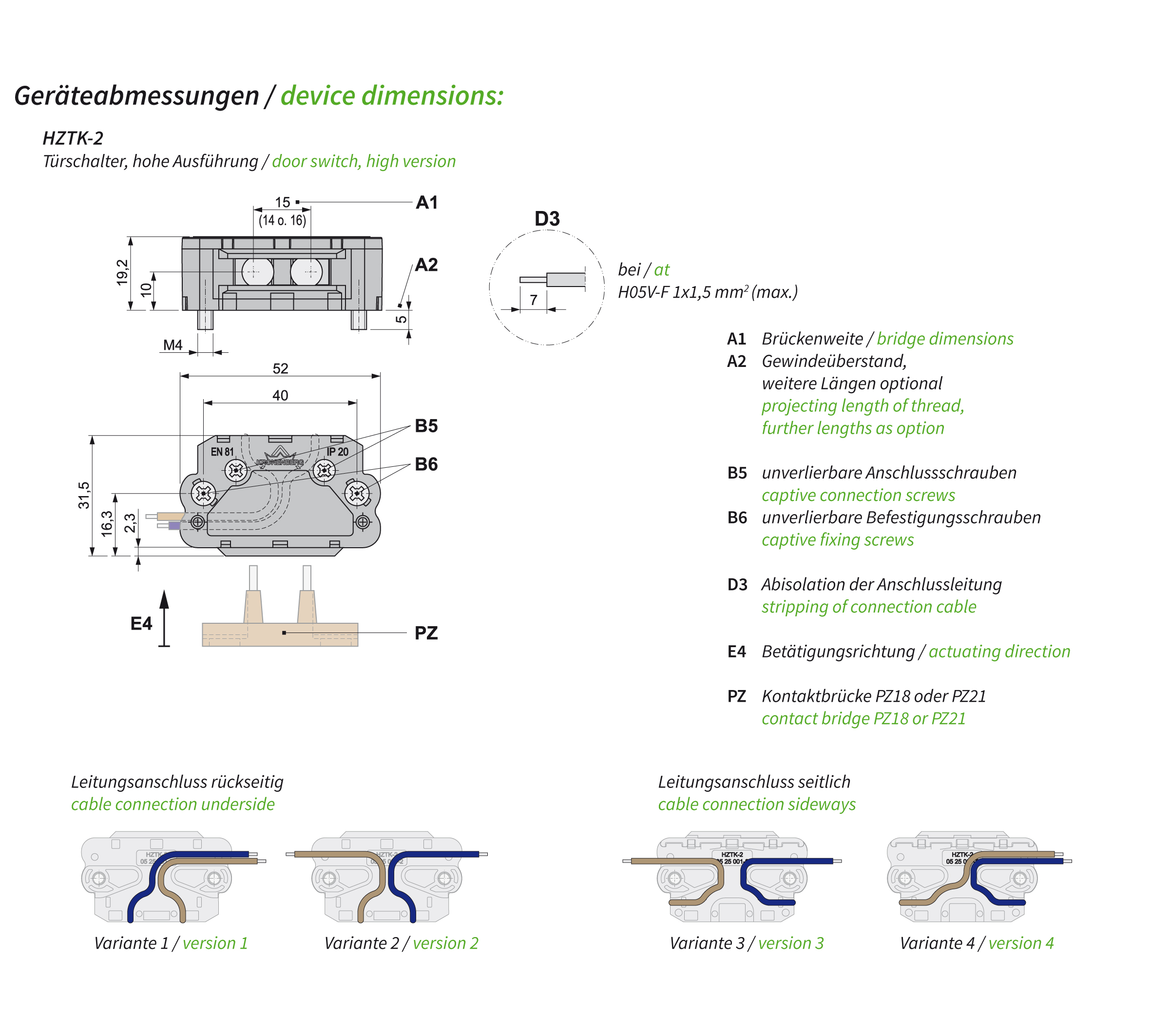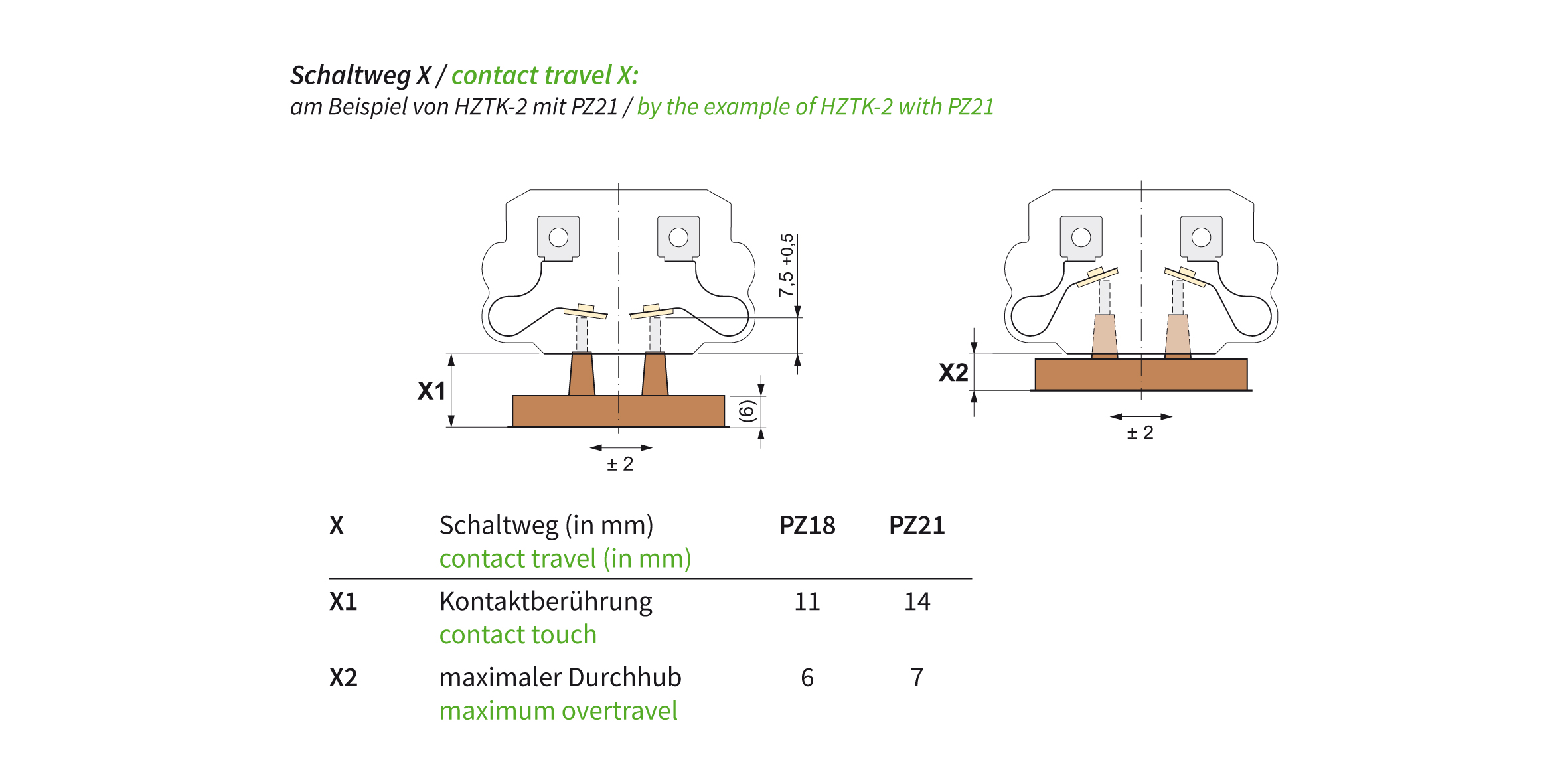 The innovative HZTK is a safety switch with forced actuation which can be used as door switch and switch for locking mechanism. It allows a large sliding area between contact bridge and switch. In addition to the standard design (HZTK-1), a higher version is available (HZTK-2), at which the connection cables can be laid below the switch.
