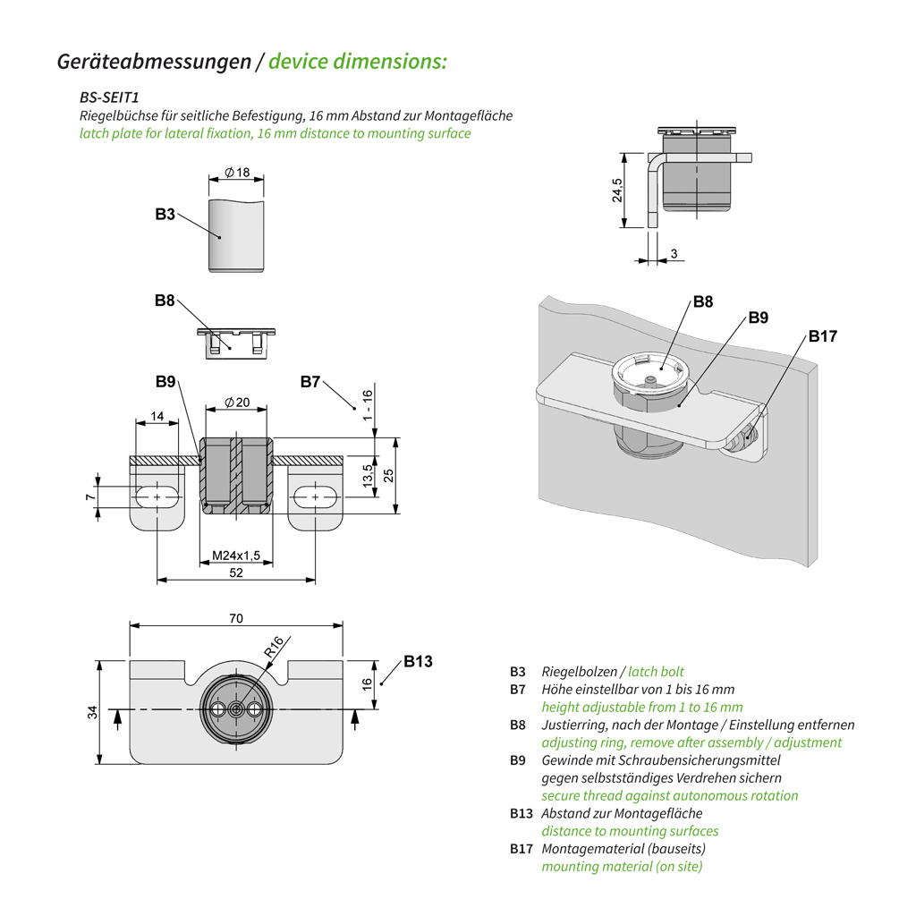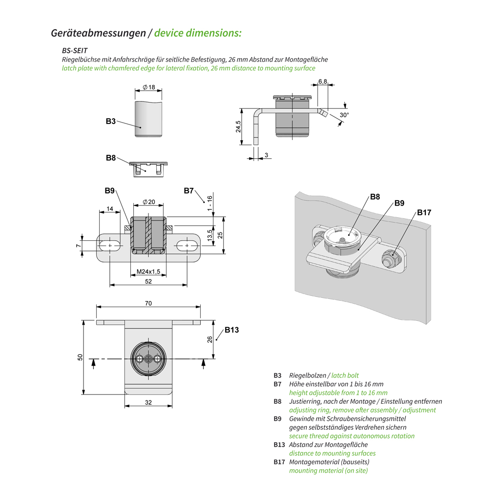 Die Ausführung BS-SEIT ist für das seitliche Anflanschen an die zu sperrende Tür konzipiert und eignet sich daher besonders gut für Modernisierungslösungen. Der Büchsenkern ist höhenverstellbar, was eine flexible Anpassung an die Gegebenheiten vor Ort ermöglicht.