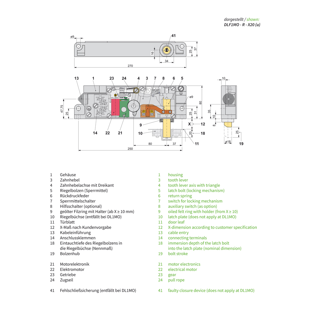 Mit der Türverriegelung DL(F)1MO werden die Schachttüren nahezu geräuschlos entriegelt und verriegelt. Dafür sorgt der im DL(F)1MO integrierte Elektromotor, der den Bolzen zuverlässig, leise und mit hoher Kraft anziehen kann.