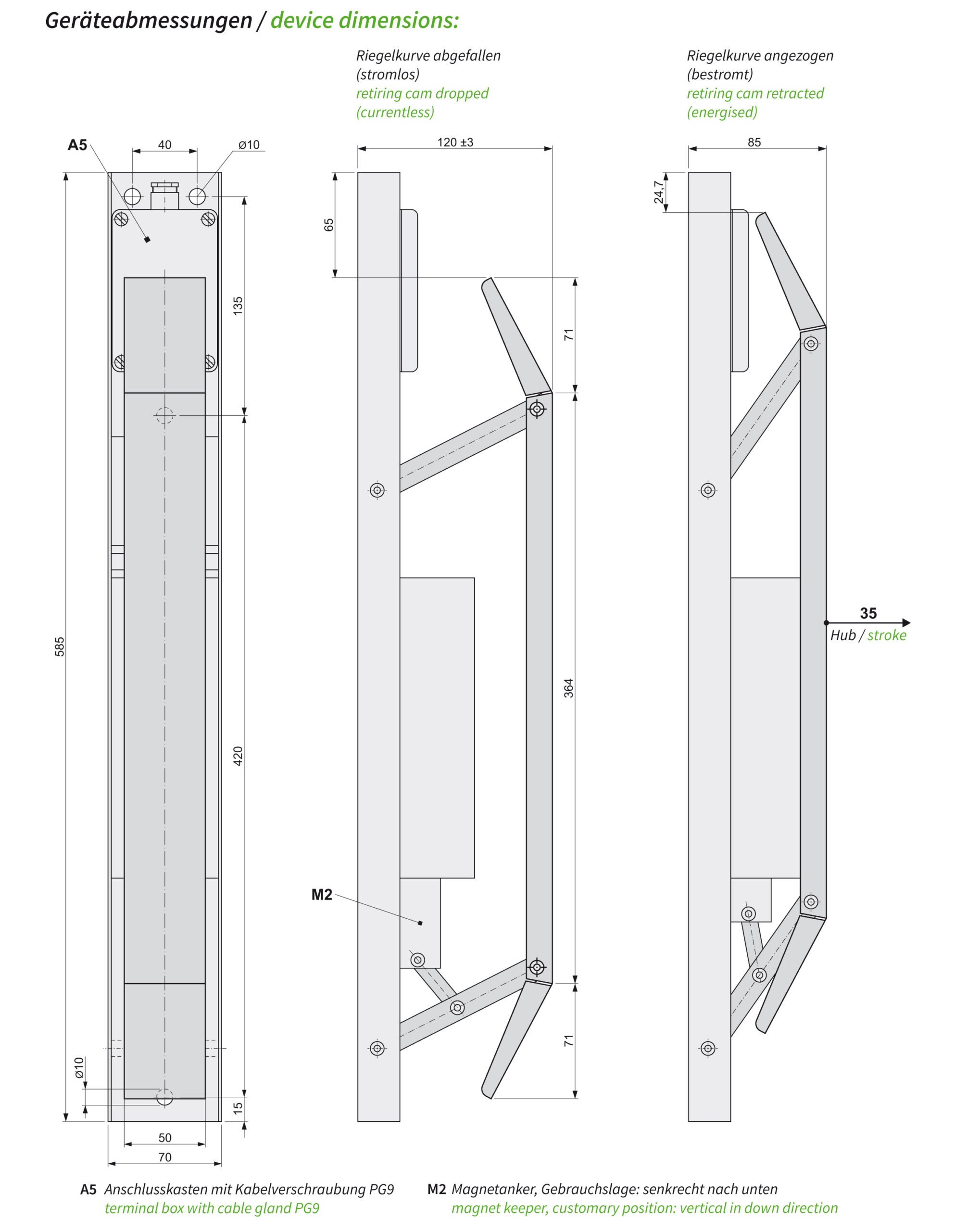Die elektromagnetische Riegelkurve EMT17-IP65 ist für Anlagen geeignet, für die ein besonderer Staub- und Wasserschutz erforderlich ist. Sie ist aufgrund der Edelstahlteile besser gegen Korrosion geschützt, weist allerdings eine etwas geringere Betätigungskraft auf.