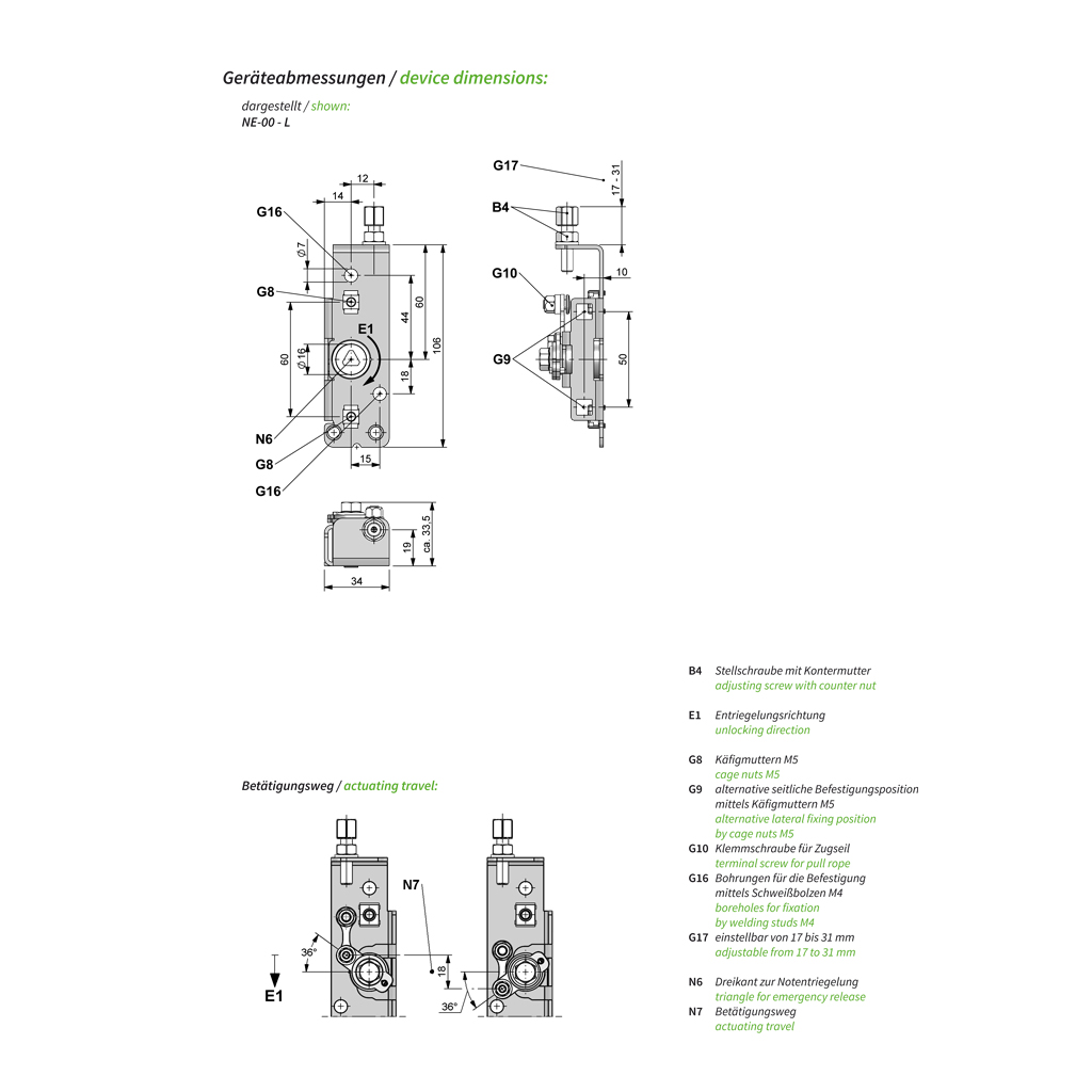 Die Dreikant- Notentriegelungseinheit Typ NE sind für die Realisierung einer Notentriegelung an einer gut zugänglichen Stelle vorgesehen. Sie betätigen die an der Verriegelung angebrachten Seil- bzw. Bowdenzüge. Sie eignen sich auch zur Nachrüstung bestehender Anlagen zur Erhöhung der Sicherheit auf Stand der Technik.