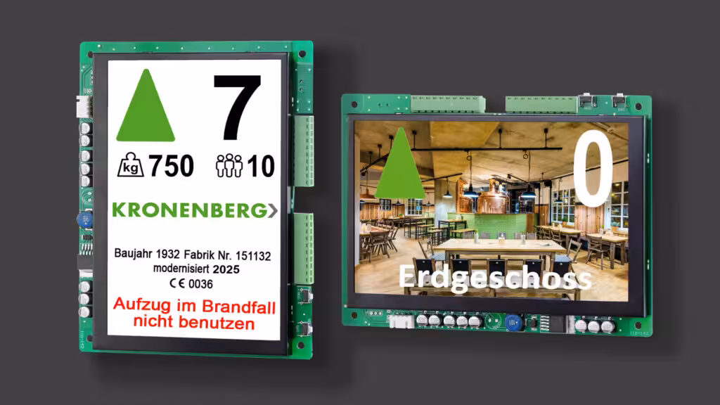 Die 7,0-Zoll-Anzeige ist ideal für Kabinentableaus mit Sonderfunktionen und der Darstellung von Aufzugdaten wie Tragfähigkeit, Baujahr, Fabriknummer oder Firmenlogo. Sie zeigt bis zu 64 Etagen sowie bis zu 7 Aufzughinweise im Voll- oder Teilformat an und verfügt über eine statische Richtungsanzeige.