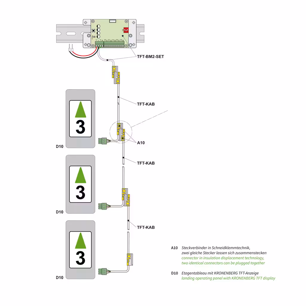 Das TFT-BM-SET bietet eine serielle Ein-Draht-Bus-Anbindung mehrerer Anzeigen sowie flexible Montagemöglichkeiten. Das TFT-KAB dient als steckbares, erweiterbares Schachtkabel für eine unkomplizierte Verdrahtung im Aufzugsschacht.