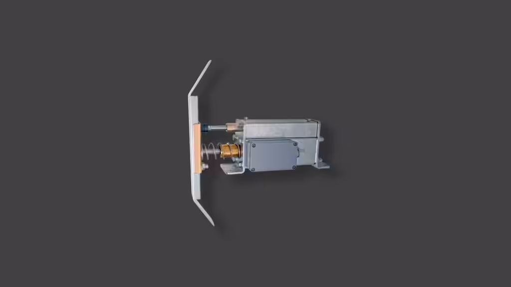 Die elektromagnetische Riegelkurve EMT13-W in Schutzart IP54 ist für die Montage auf dem Kabinendach vorgesehen. Die eigentliche Betätigungskurve ist zur Anpassung an die Gegebenheiten vor Ort stufenlos in der Höhe verstellbar. Die Kraft ist etwas geringer im Vergleich zur EMT17-W.