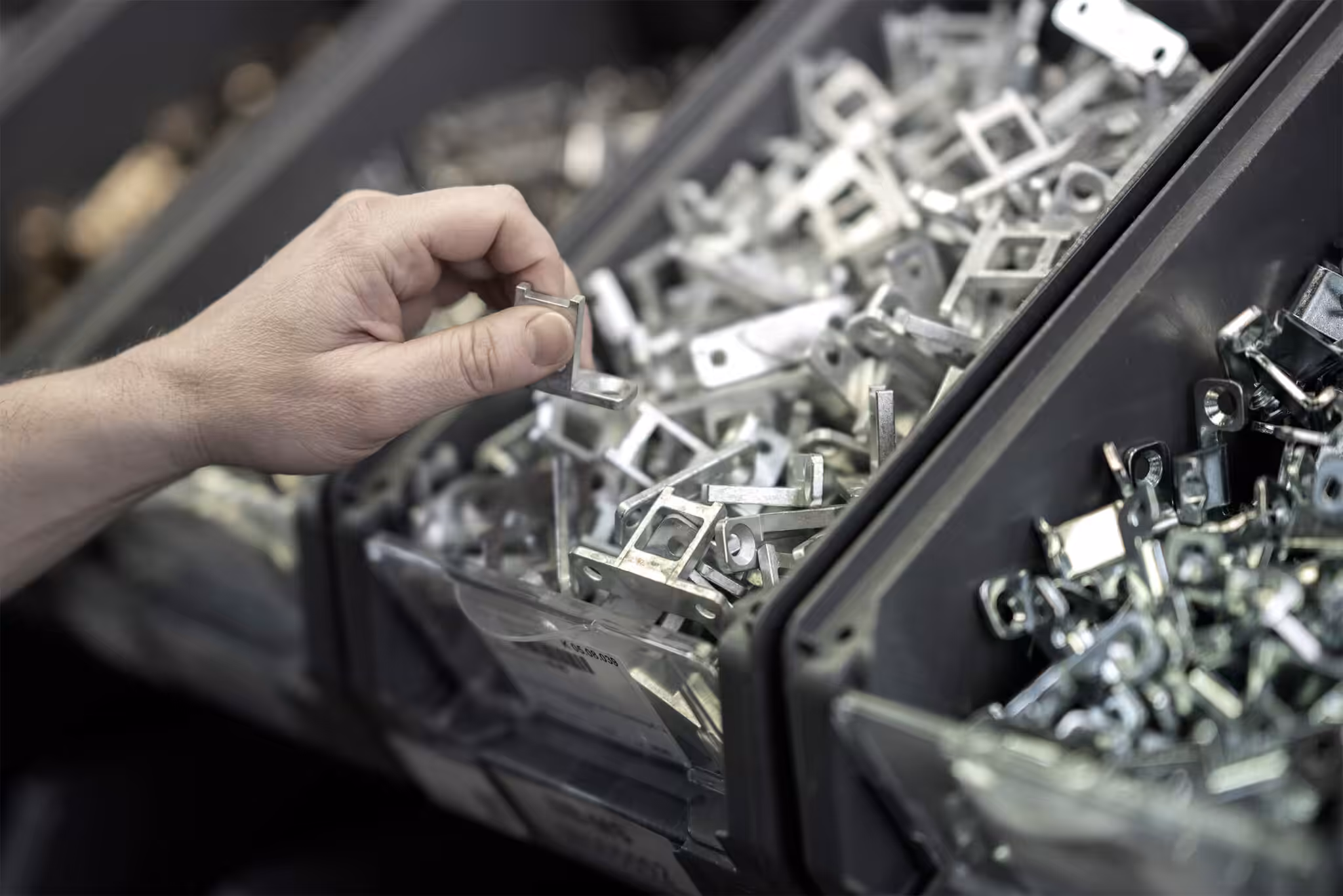 Die fertigen Gehäuse kommen sodann gemeinsam mit den vorgefertigten Riegelbolzen und weiteren Bauteilen für die Türverriegelungen (wie beispielsweise Zahnhebel, Rollenhebel, Sperrschieber, Kontakteinsätzen etc.) in die Endmontage.