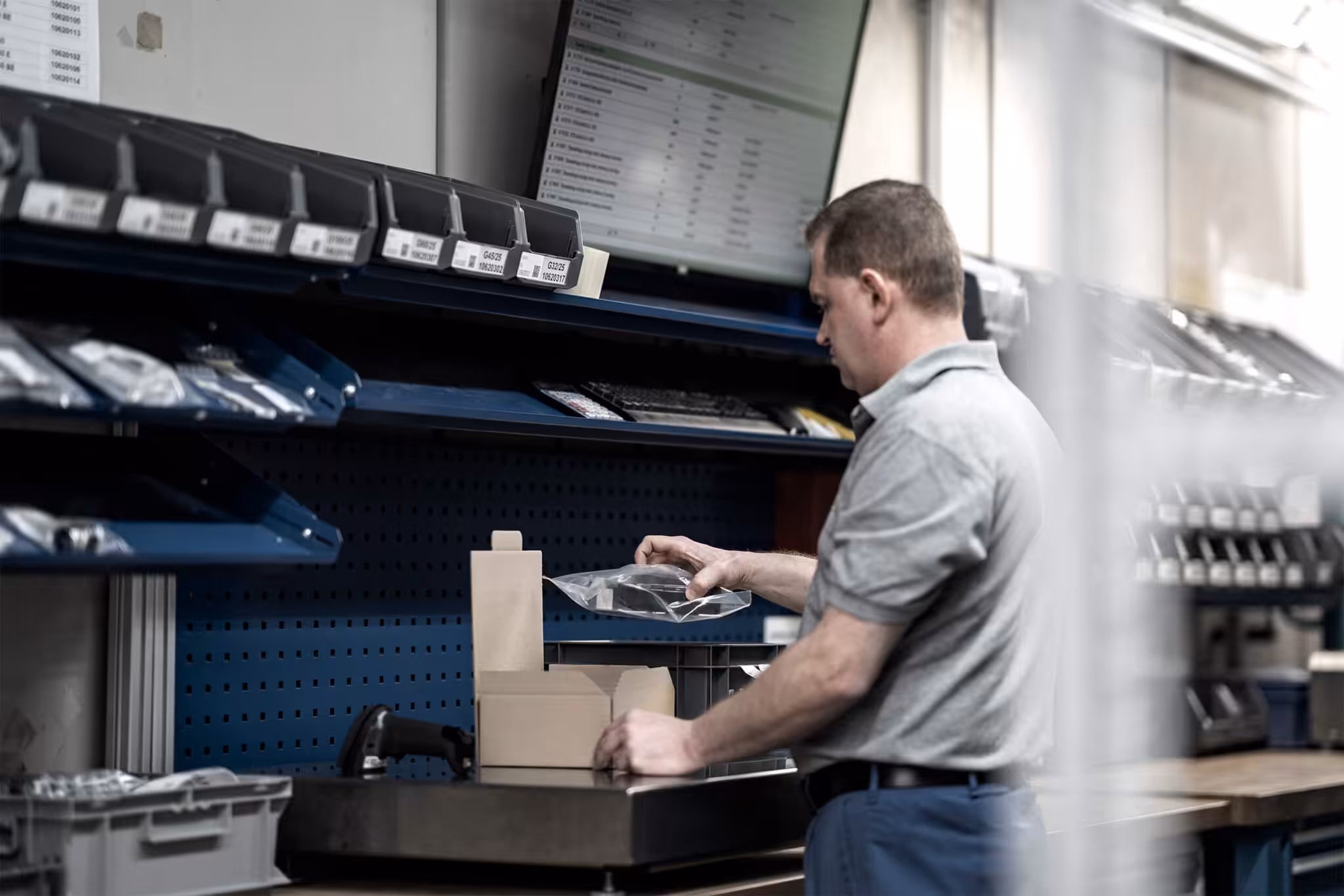 In unserem Versand erfolgt die finale Materialentnahme und das Scannen der QR-Codes, um unseren Kunden einen Lieferstatus just in time mitteilen zu können.