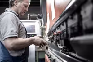 Nach der CAD-Konfiguration der Bedien- und Anzeigetableaus im Vertrieb erfolgen die V2A-Zuschnitte in unserem Blechbearbeitungszentrum. Hier werden alle Stanzungen durchgeführt.
